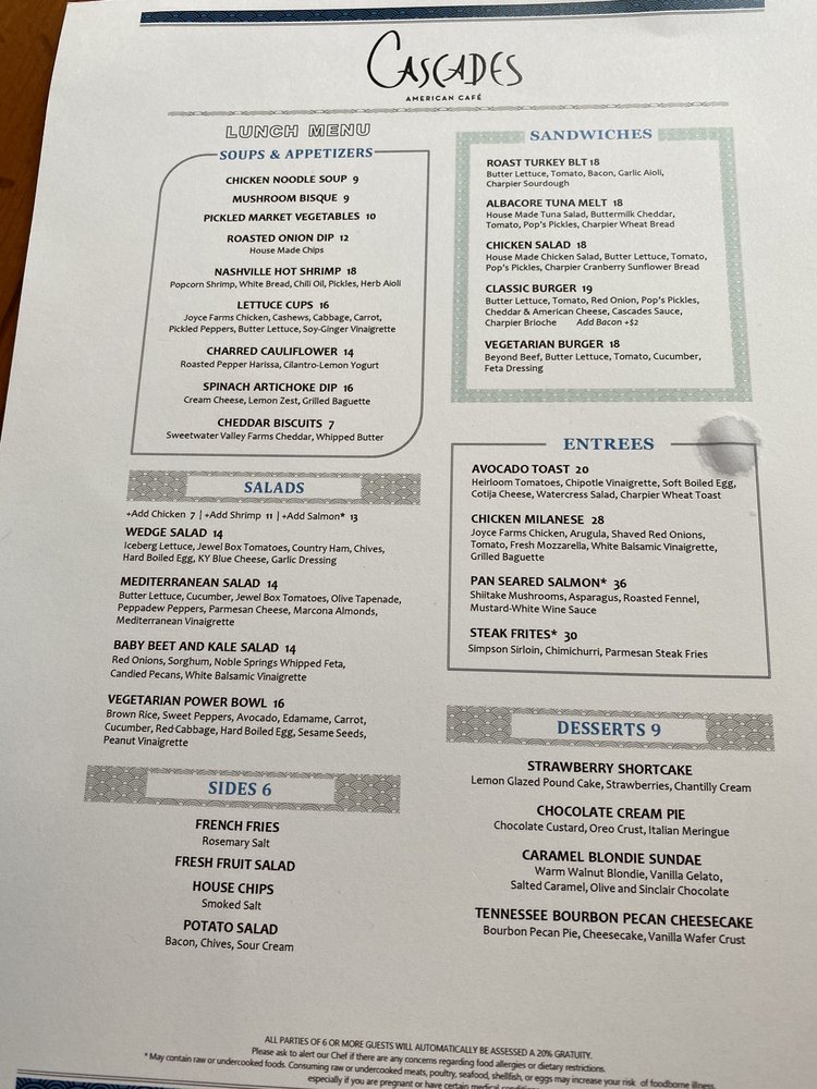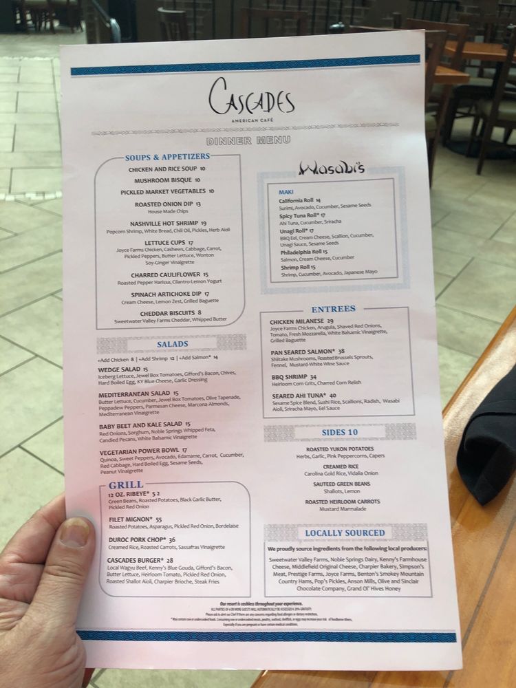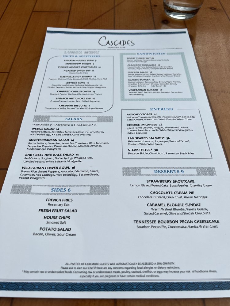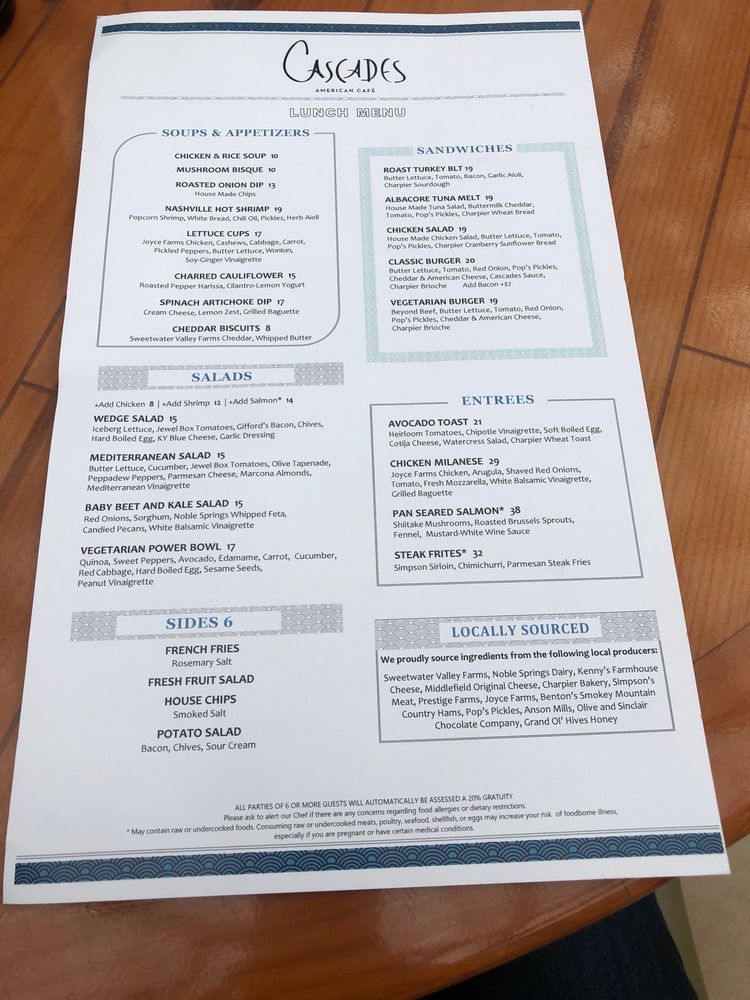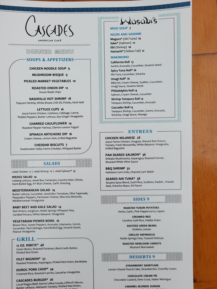 Introducing the menu at Cascades American Cafe, located at 2800 Opryland Dr Gaylord Opryland Resort & Convention Center Nashville, TN. This casual and touristy spot offers a range of dishes from tapas/small plates to New American cuisine, with a focus on breakfast and brunch. The restaurant provides a variety of options for vegan and limited vegetarian diets, as well as a full bar, TV, and free Wi-Fi for guests. The breakfast buffet features a mouthwatering spread of waffles, scrambled eggs, bacon, pork sausage, breakfast potatoes, oatmeal, grits, biscuits, bagels, fresh fruit, yogurt parfait, and more. With its wheelchair accessibility, parking, and attentive waiter service, Cascades American Cafe is a great choice for groups, families, and anyone looking for a satisfying meal in a cozy atmosphere.