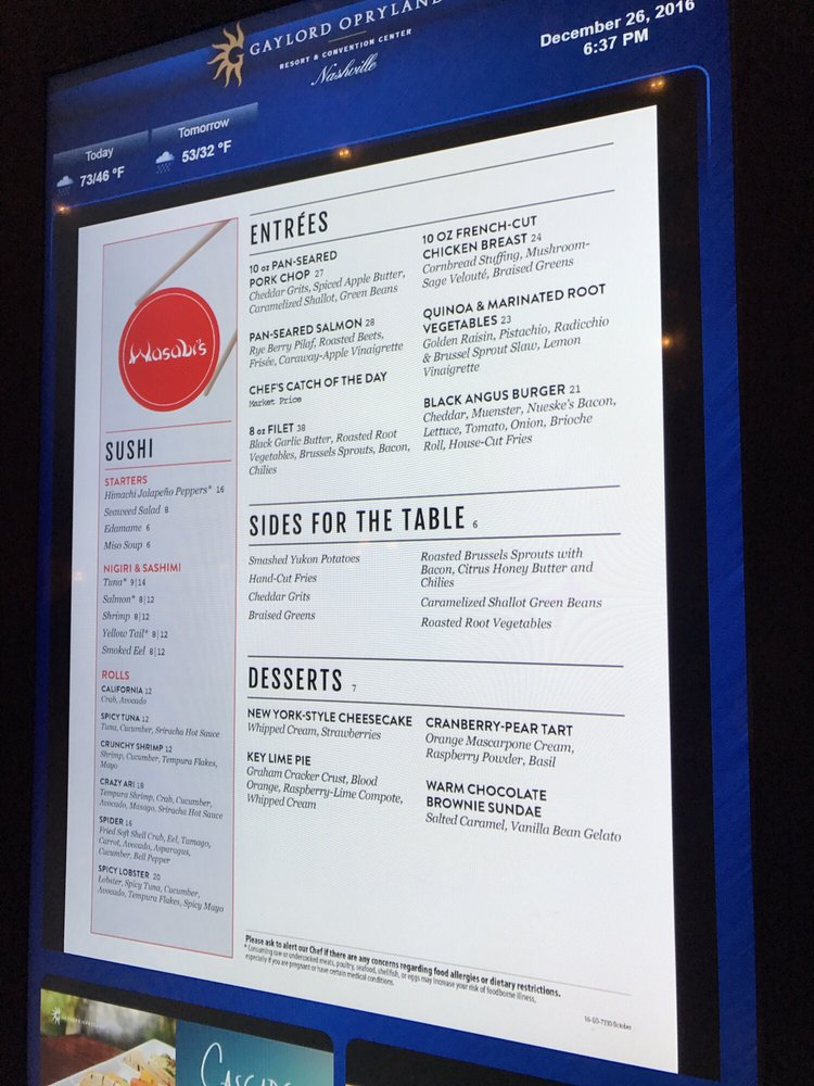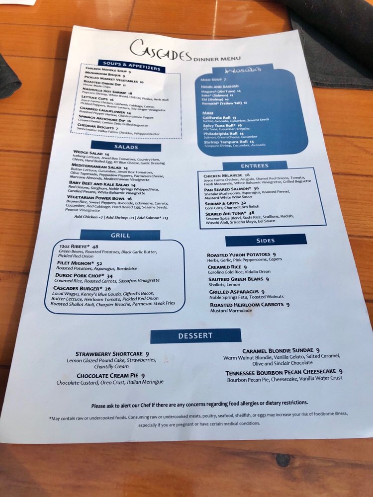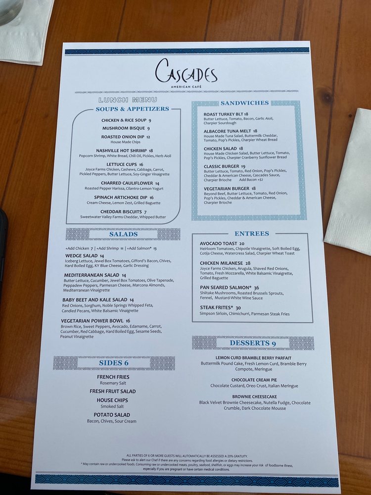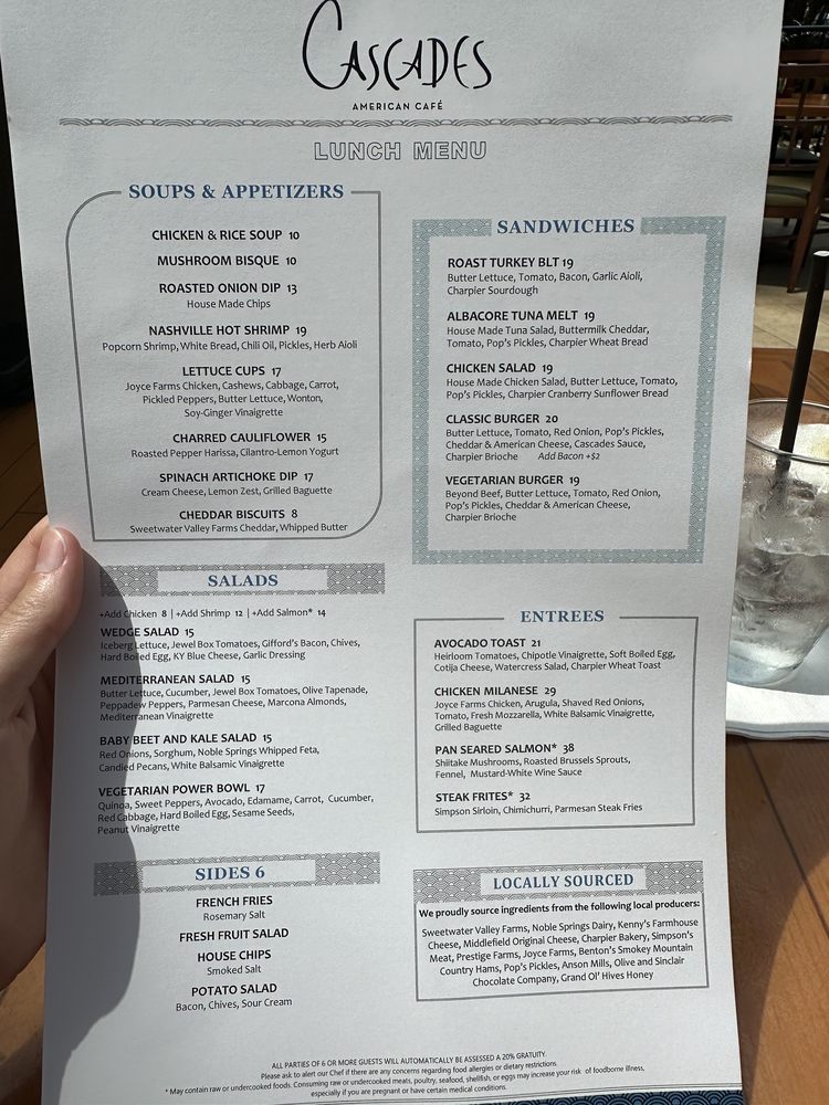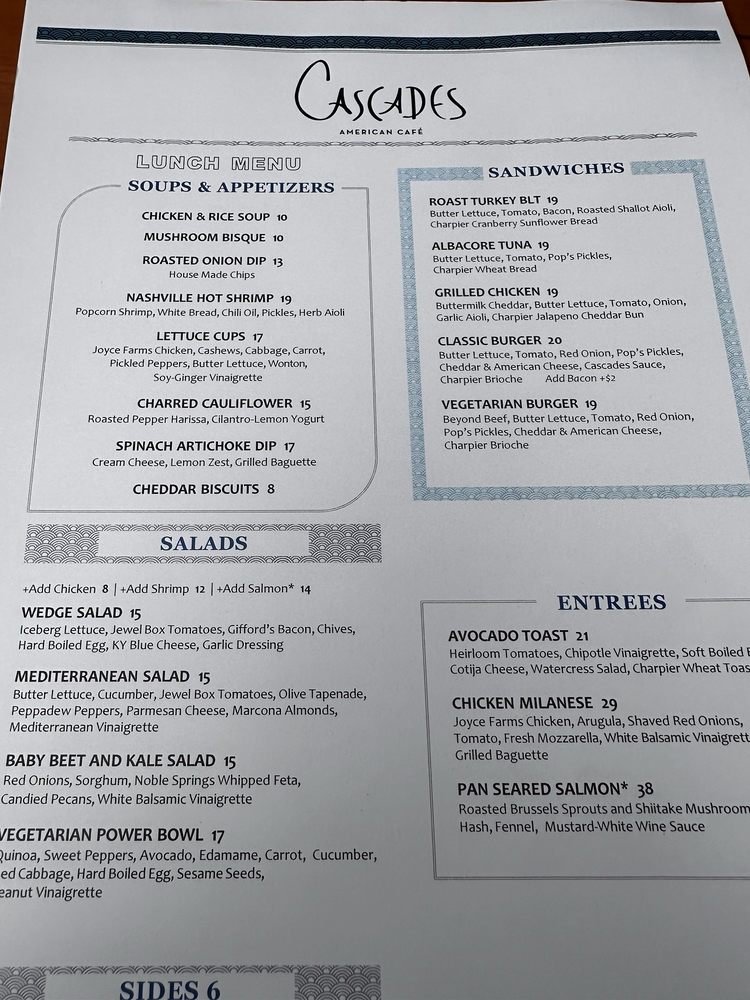 Introducing the menu at Cascades American Cafe, located at 2800 Opryland Dr Gaylord Opryland Resort & Convention Center Nashville, TN. This casual and touristy spot offers a range of dishes from tapas/small plates to New American cuisine, with a focus on breakfast and brunch. The restaurant provides a variety of options for vegan and limited vegetarian diets, as well as a full bar, TV, and free Wi-Fi for guests. The breakfast buffet features a mouthwatering spread of waffles, scrambled eggs, bacon, pork sausage, breakfast potatoes, oatmeal, grits, biscuits, bagels, fresh fruit, yogurt parfait, and more. With its wheelchair accessibility, parking, and attentive waiter service, Cascades American Cafe is a great choice for groups, families, and anyone looking for a satisfying meal in a cozy atmosphere.